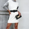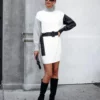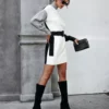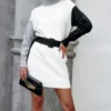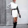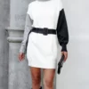 Featuring a high mock neckline, long sleeves, and a relaxed fit, it offers a chic and cozy look. The ribbed knit collar, cuffs, and hem add texture, while the removable knit belt defines your waist. Style with knee high boots and a matching black clutch for an elevated day to night look.