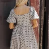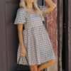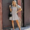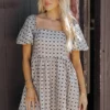 This Taupe Puff Sleeve Bow Print Mini Dress offers a sweet and stylish look.