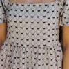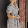 It features short puff sleeves and a flattering square neckline that adds a touch of elegance. The dress is adorned with an allover bow print, creating a whimsical charm. A back zip closure ensures easy wear, and the dress is fully lined for added comfort. Its mini length makes it perfect for pairing with your favorite heels or boots, ideal for a chic day out or a special occasion.