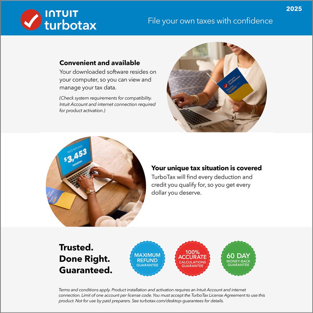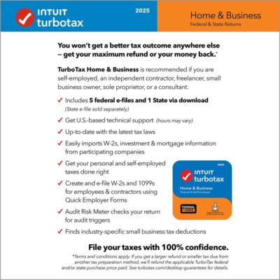 TurboTax 2025 – File your taxes with 100% confidenceTurboTax is tailored to your unique situation. It searches for hundreds of personal and small business deductions and credits, so you can be confident you’re getting every dollar you deserve.